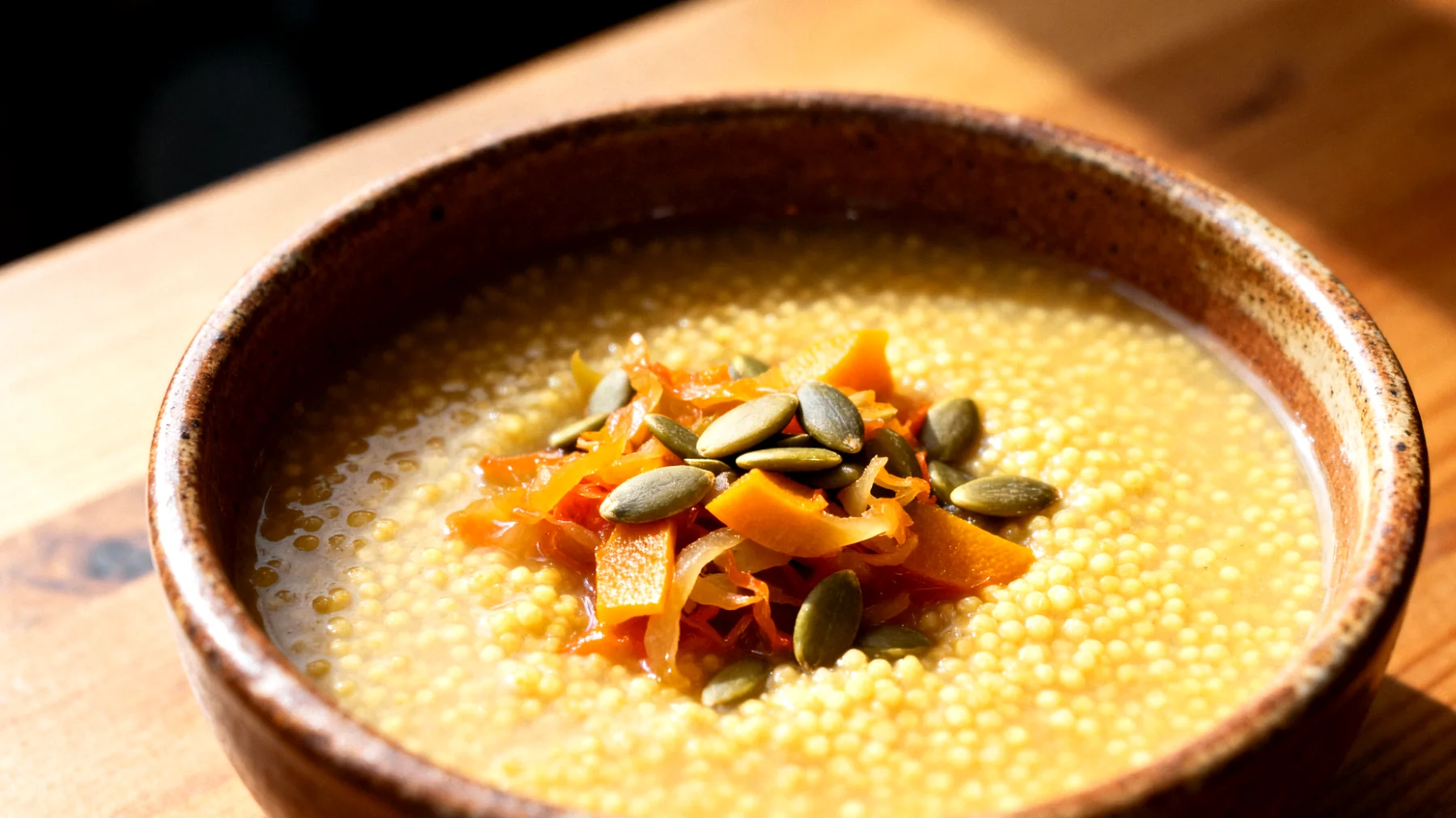 I grassi buoni presenti in questi semi, principalmente acidi grassi polinsaturi come gli omega-6, favoriscono la motilità intestinale e l’assorbimento delle vitamine liposolubili. La loro texture croccante aggiunge inoltre un contrasto interessante alla cremosità del miglio, stimolando una masticazione più lenta e consapevole.